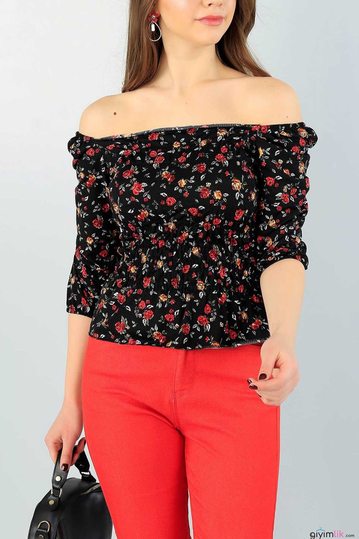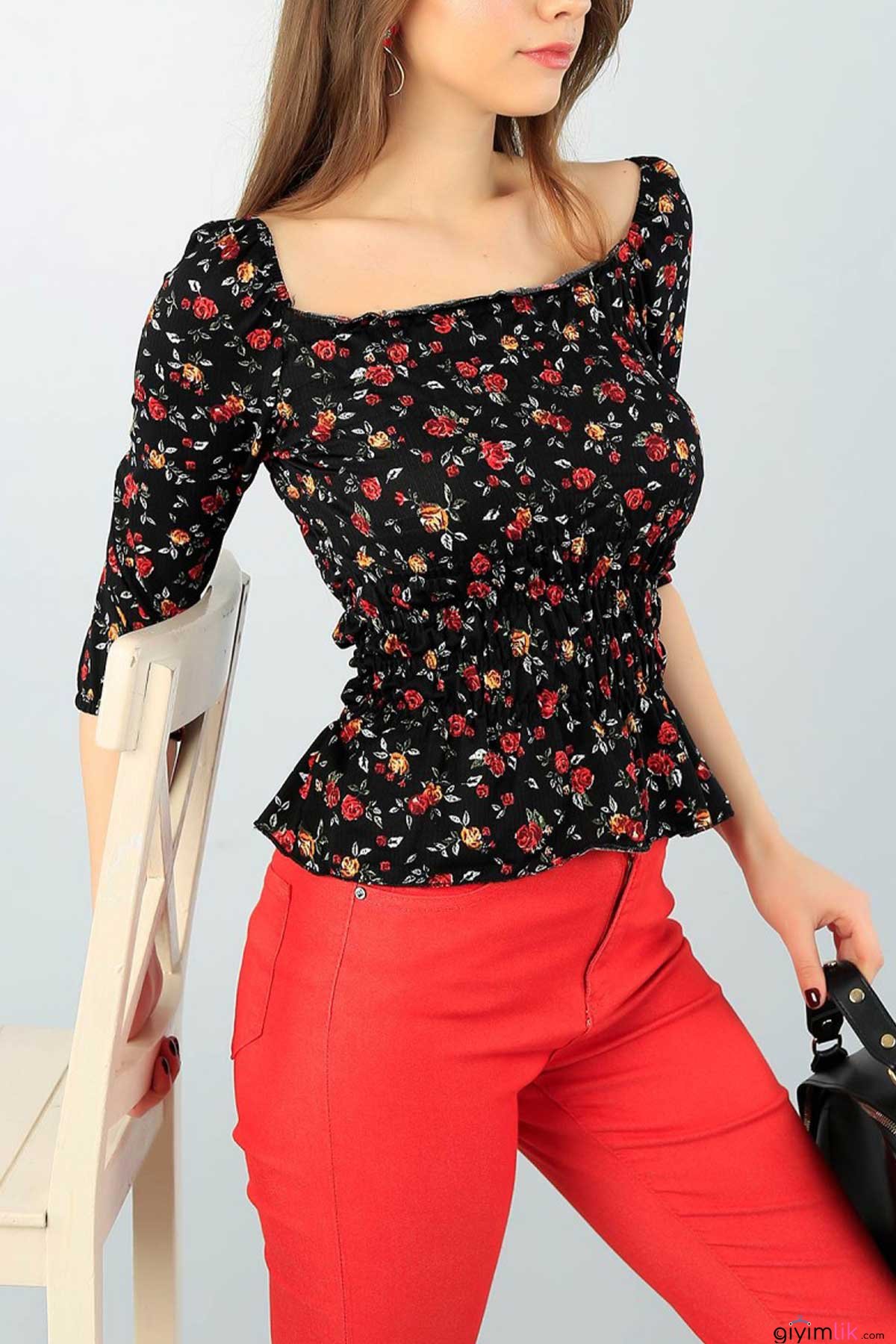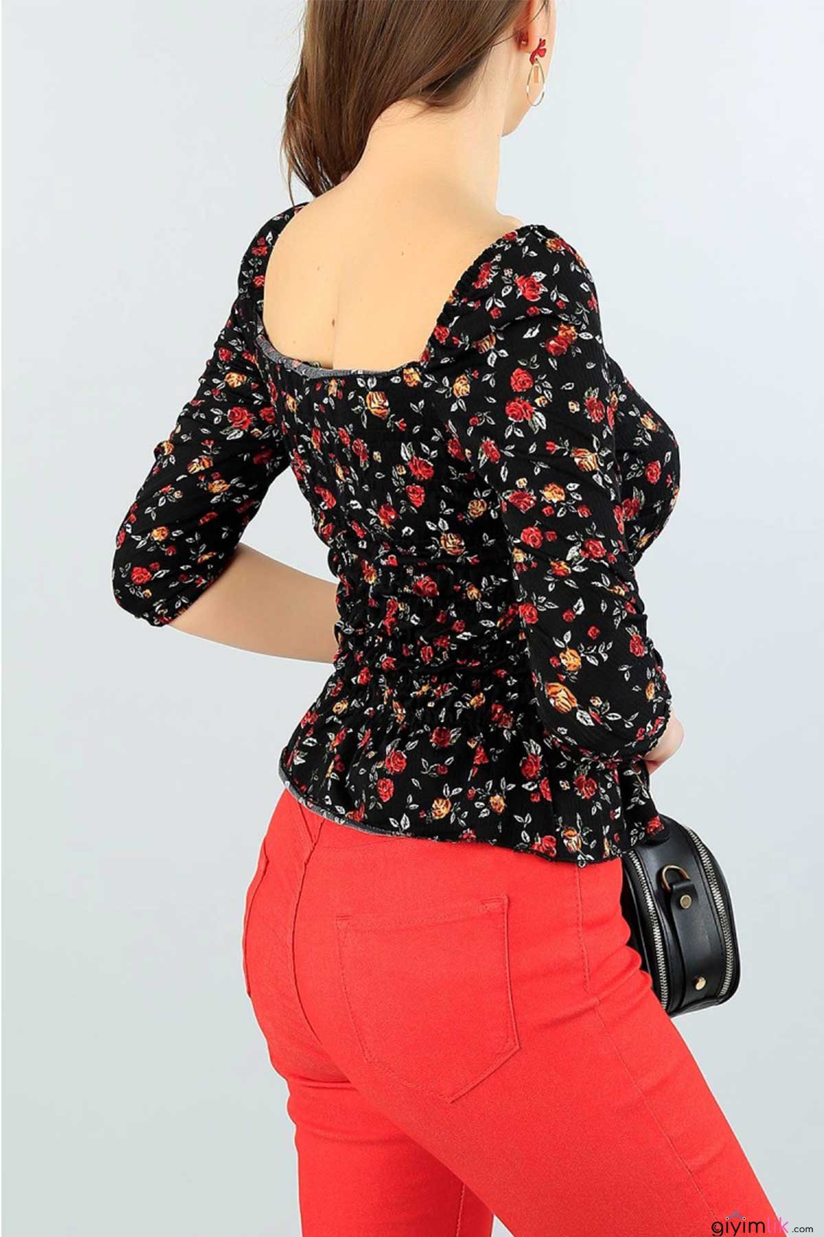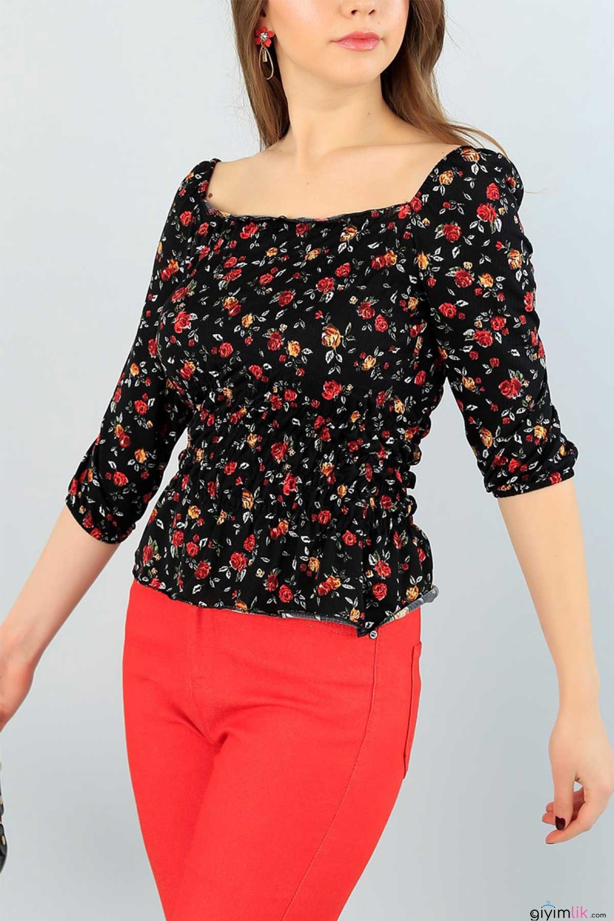 Yazın renklerini üzerinde taşımak isteyenlerin beklediği çıtı pıtı çiçekli, bel büzgülü çiçekli, siyah bluz.