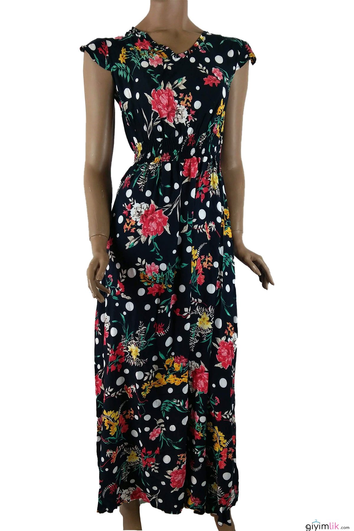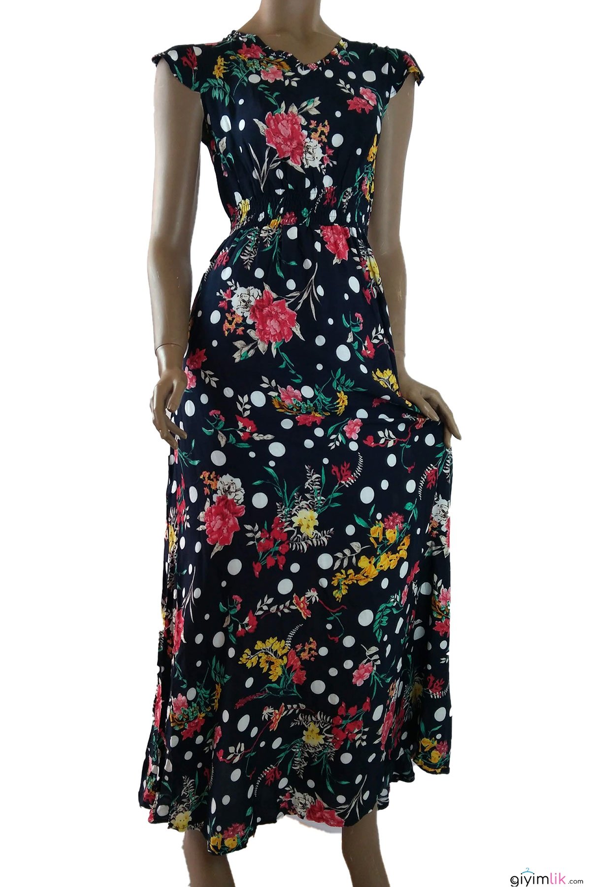 Beli gipeli, çiçekli, uzun elbise.