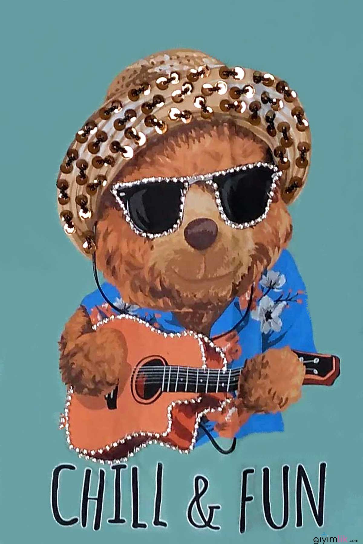 Gitarcı ayıcık figürlü, taş işlemeli tişörtümüz S-M-L bedenleri ile stoklarımızda mevcuttur.