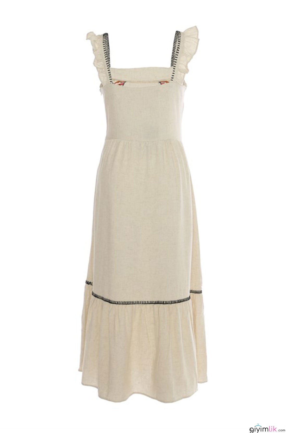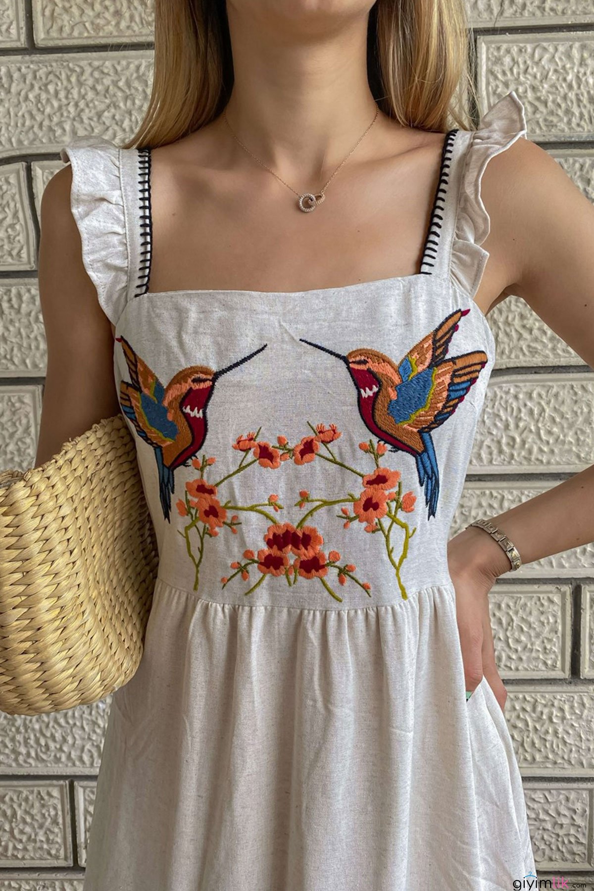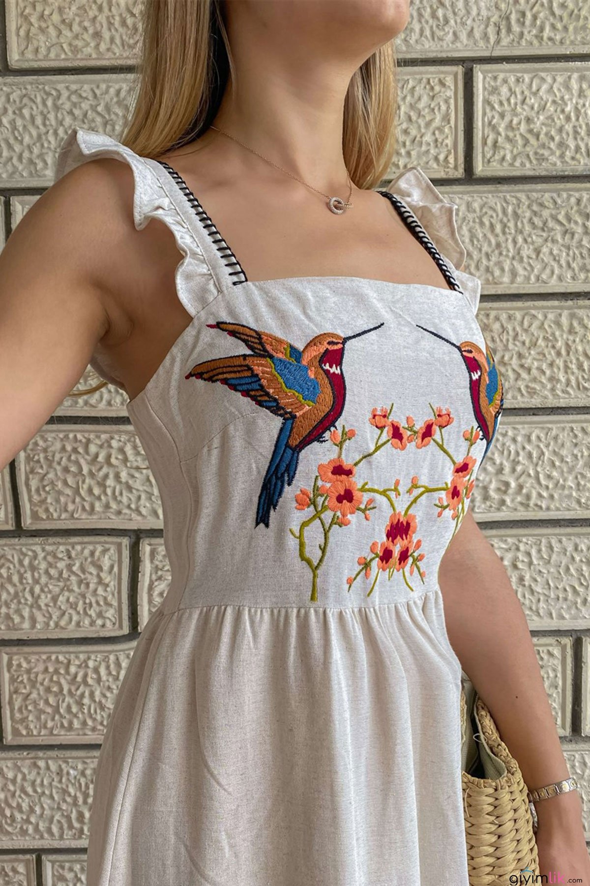 Kuş İşlemeli Nakışlı Keten Elbise (Krem)
