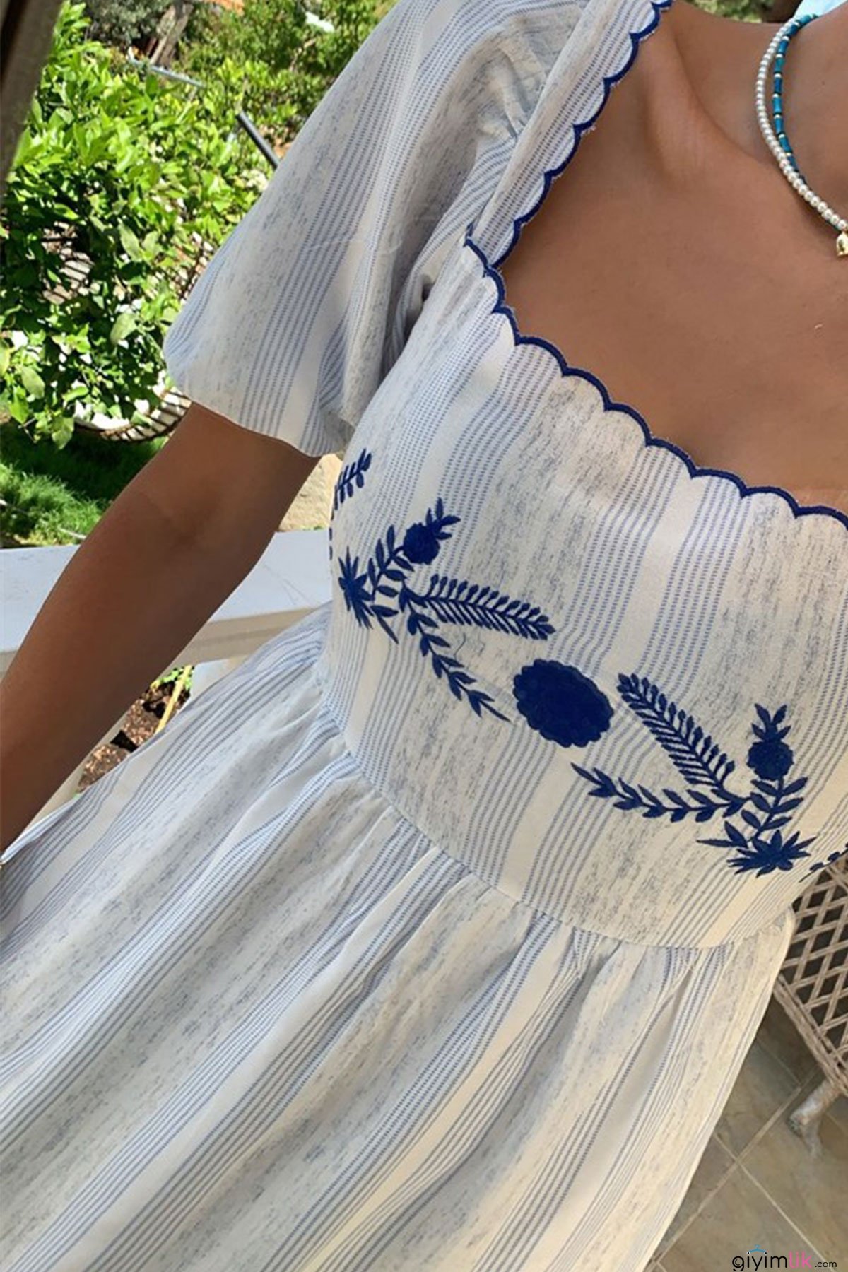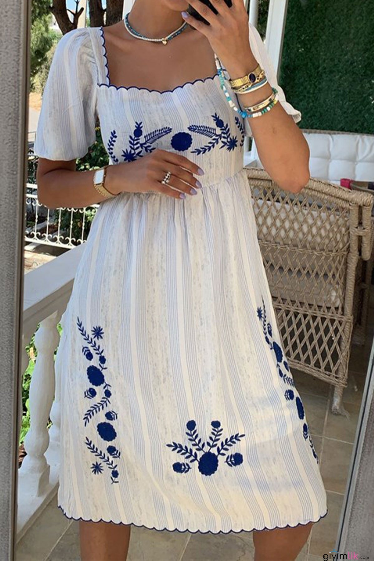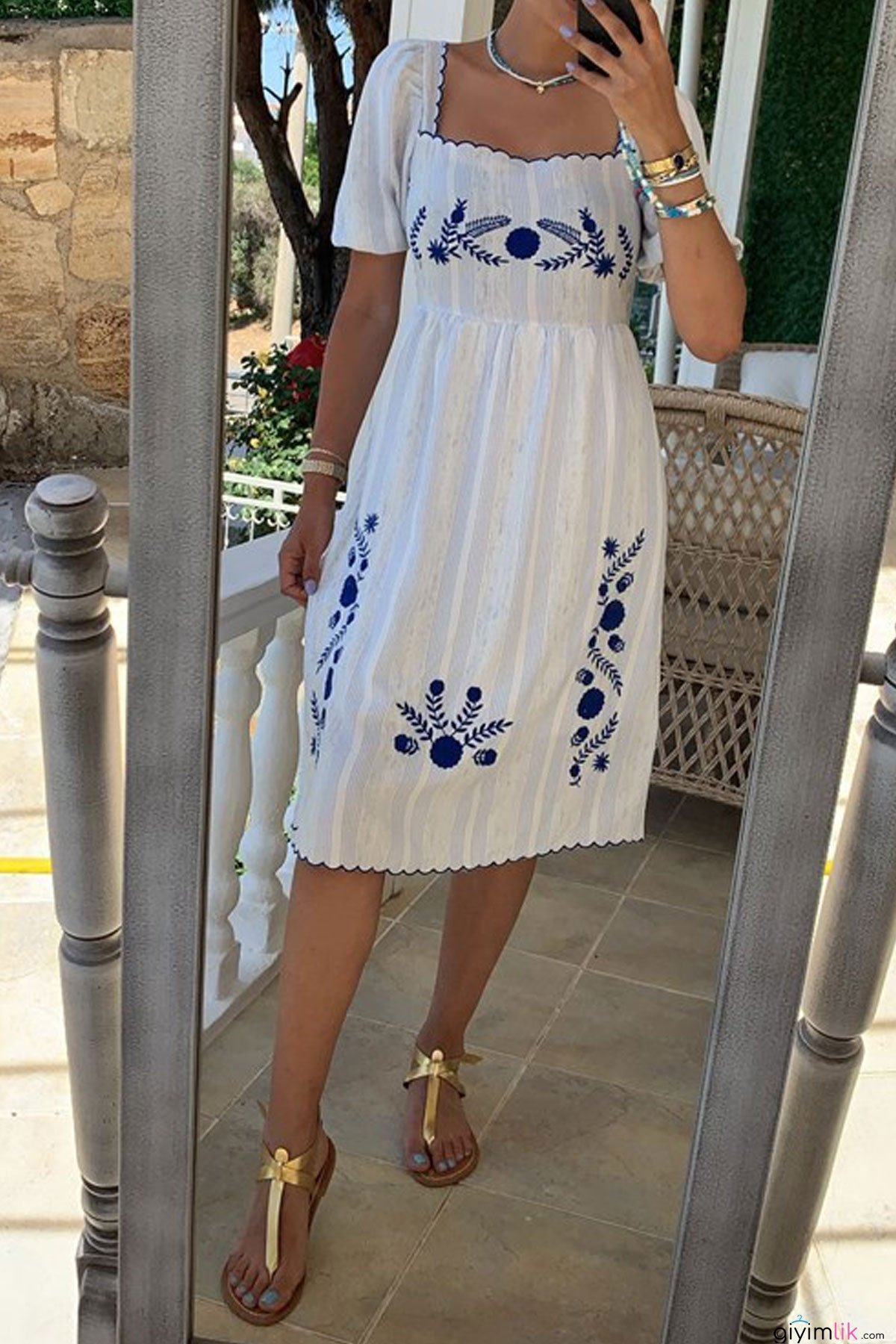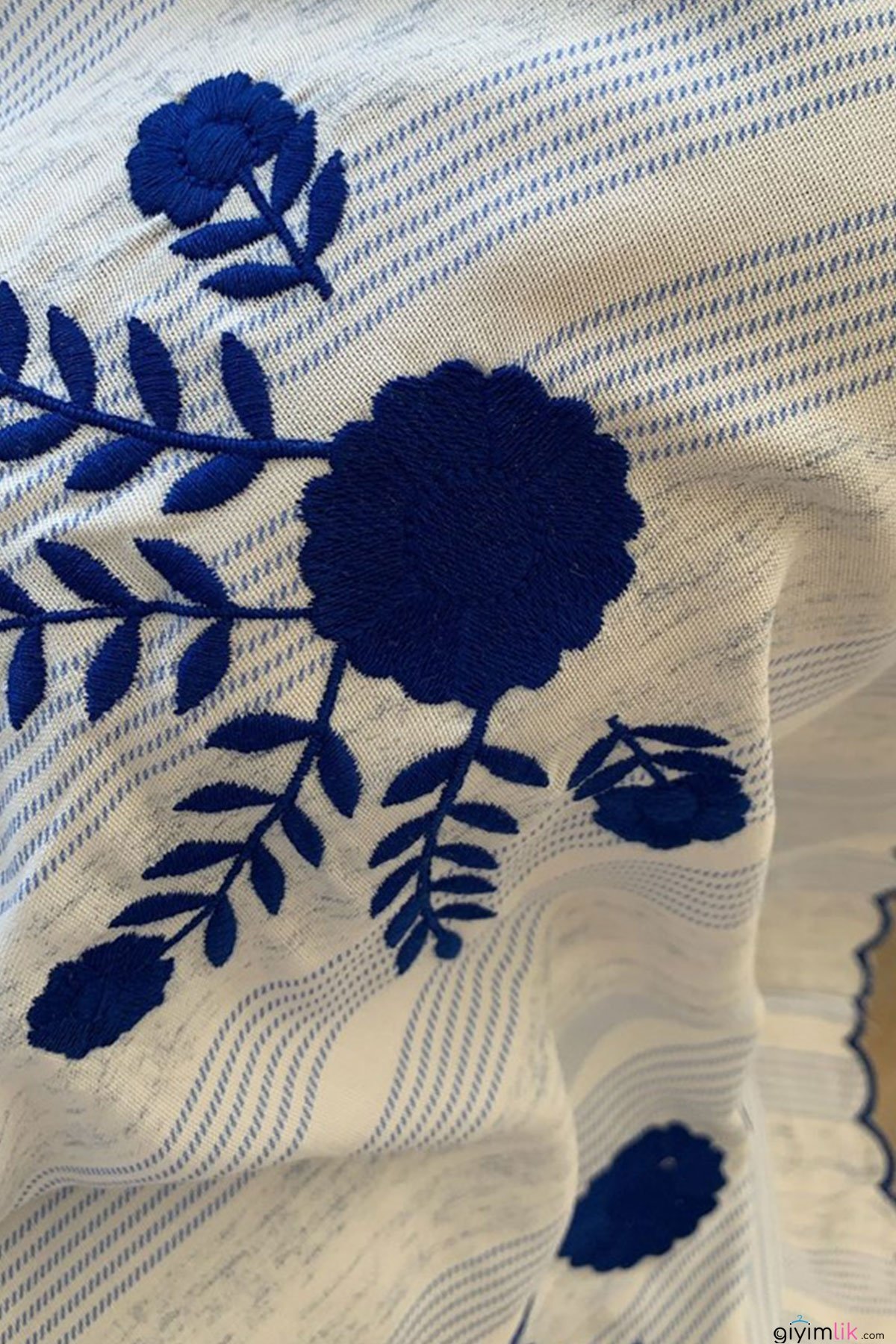Mavi Çiçek İşlemeli Beyaz Elbise
