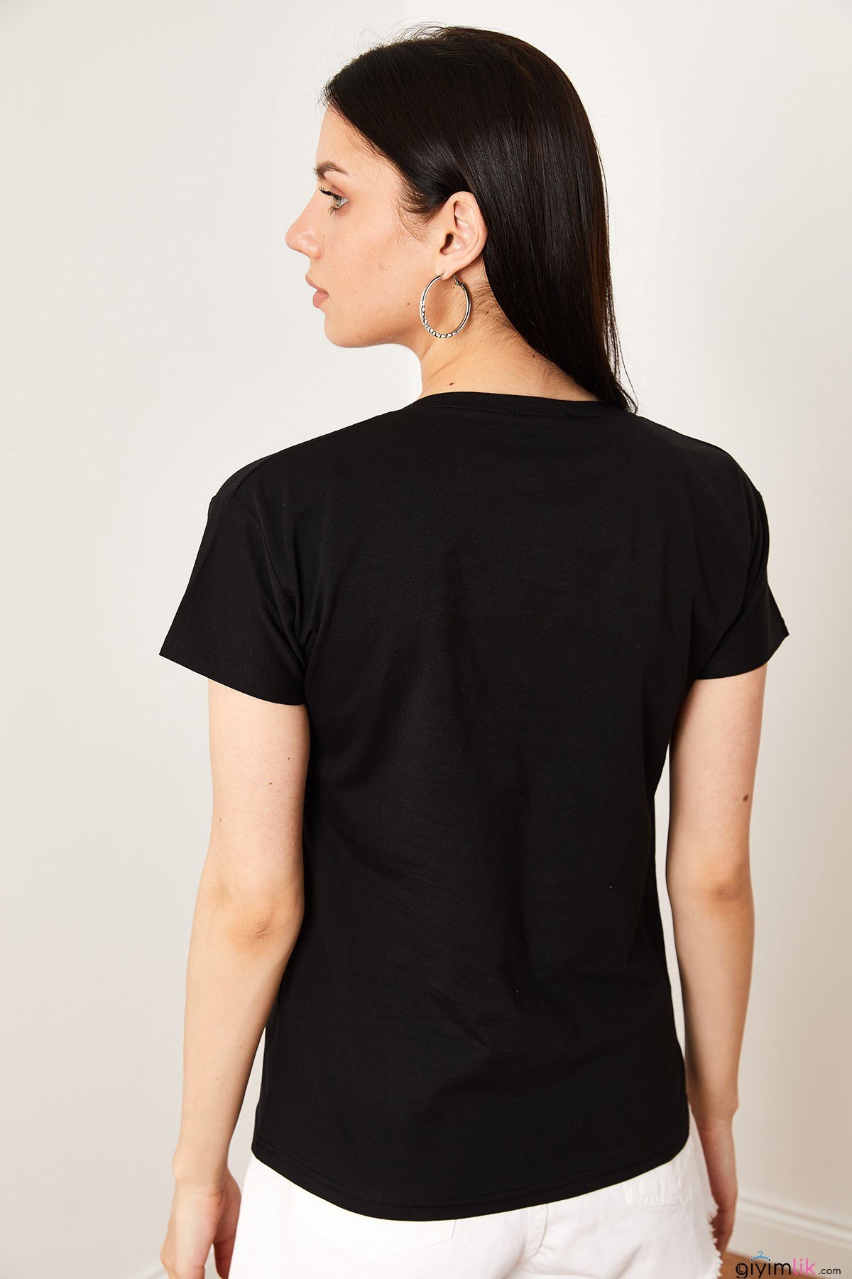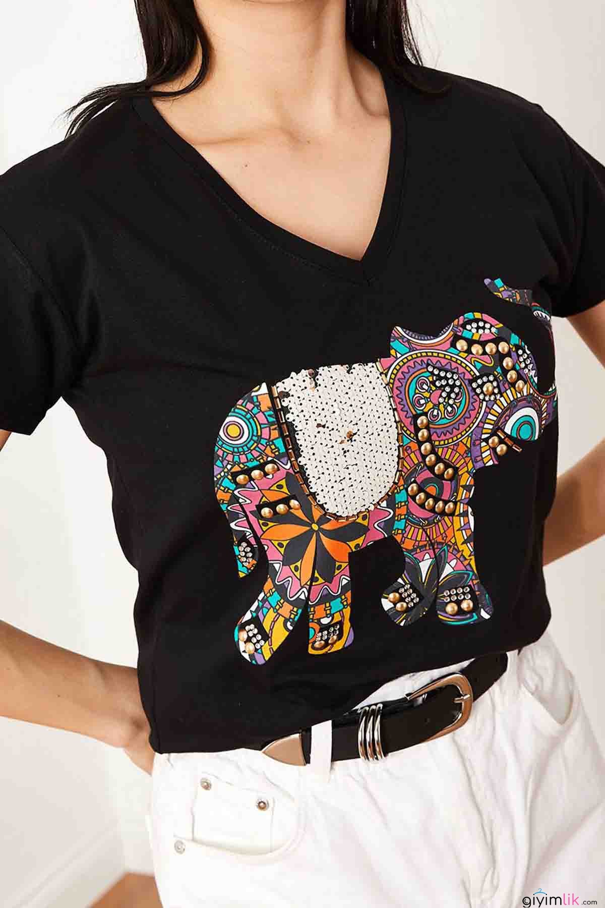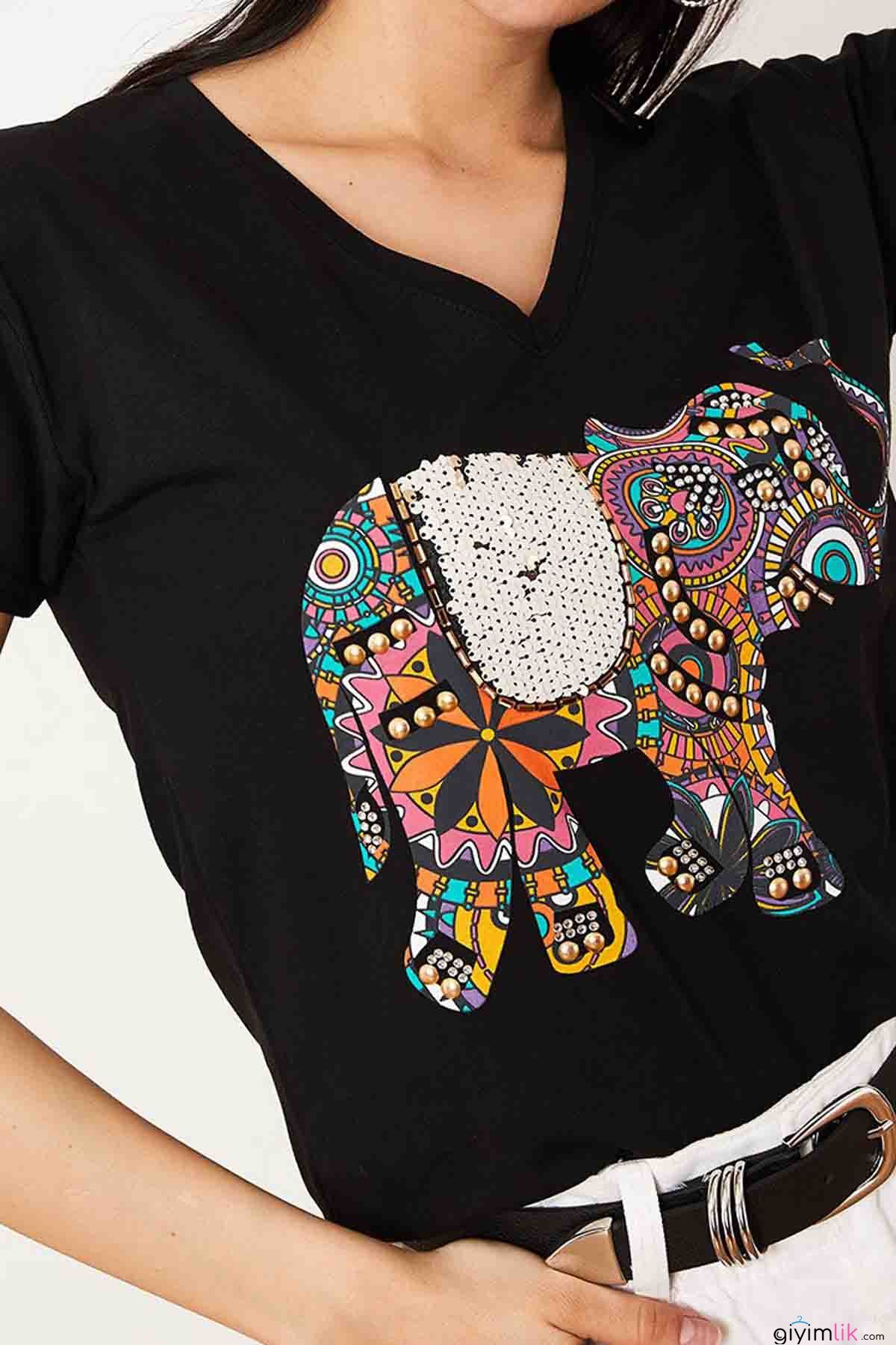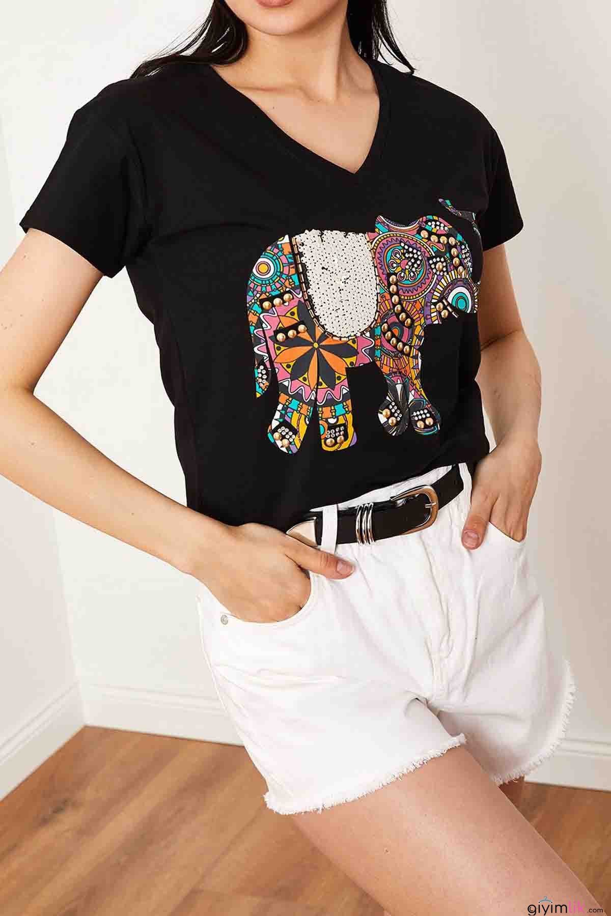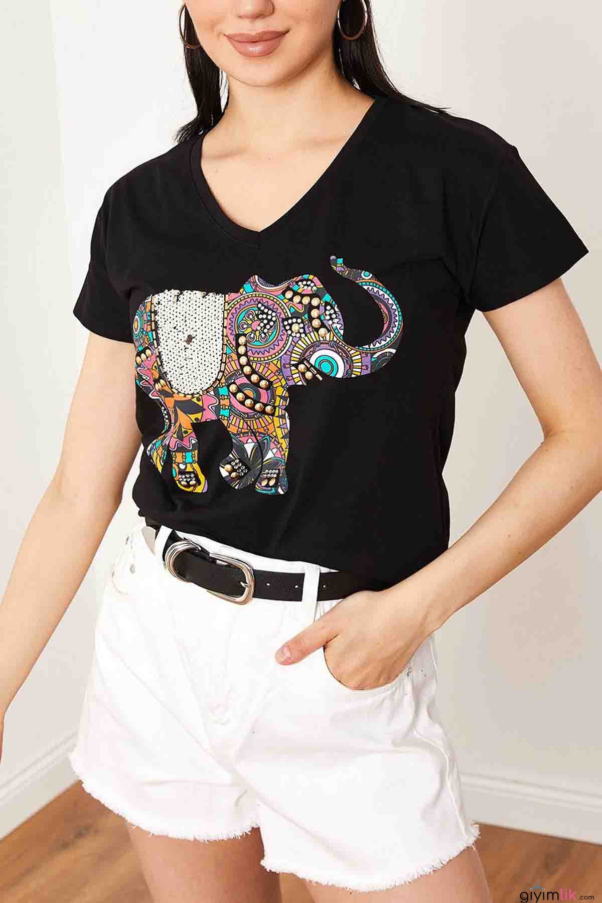 Nakışlı Taşlı Fil İşlemeli Siyah Tişört