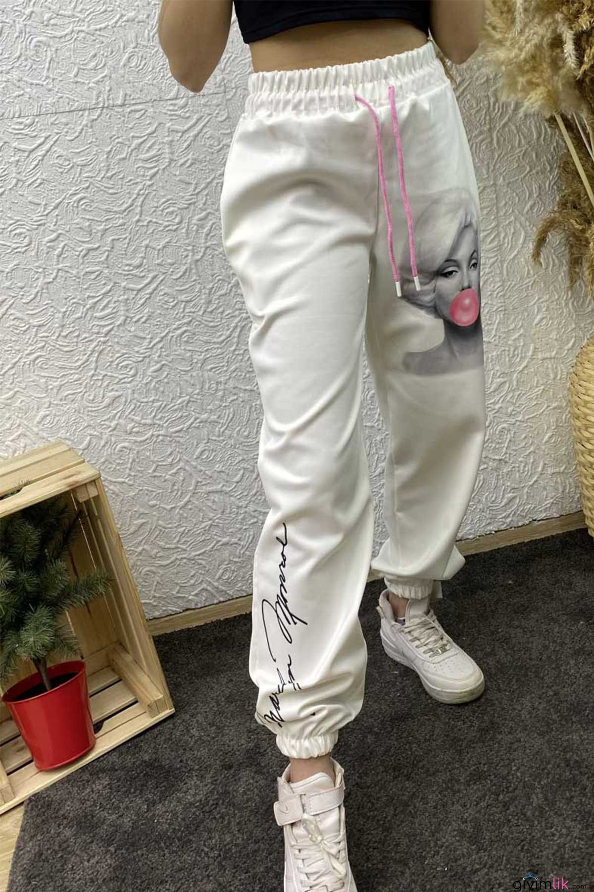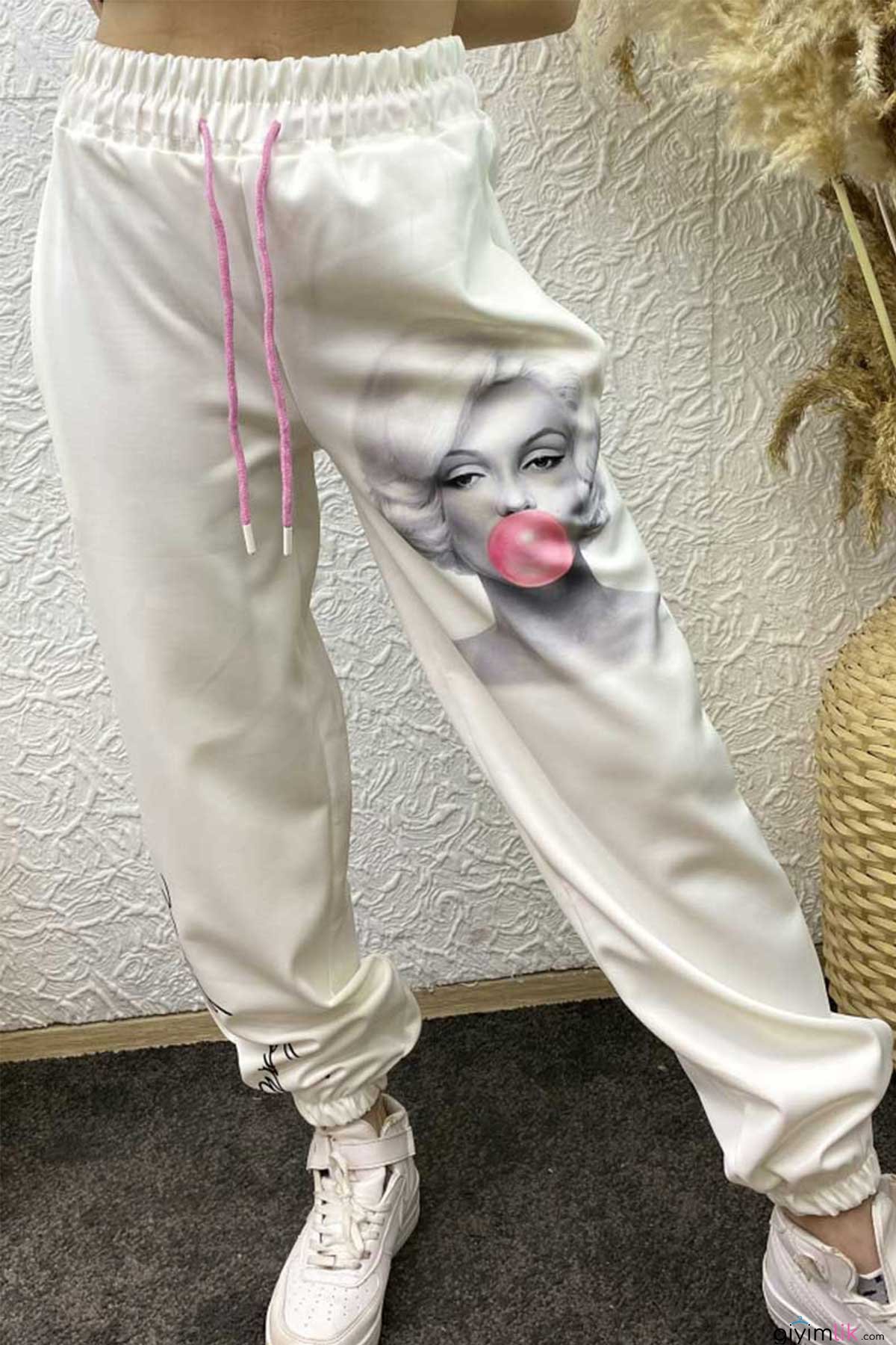 Scuba kumaş Marilyn Monroe baskılı alt eşofman stoklarımızda yerini almıştır.