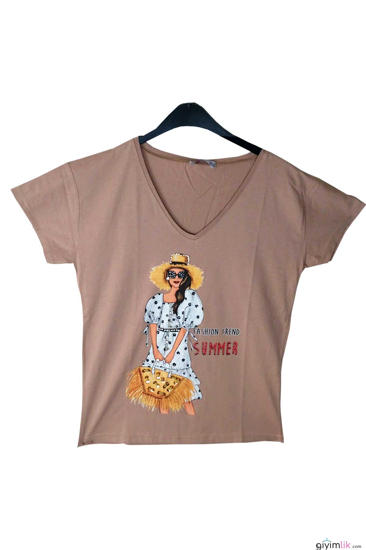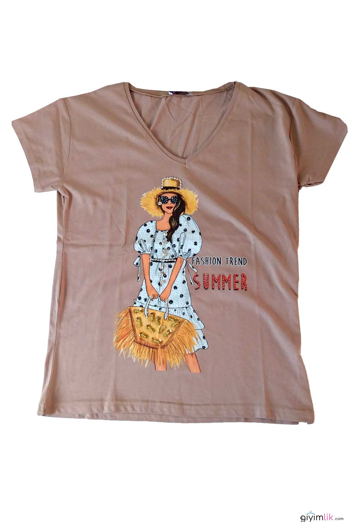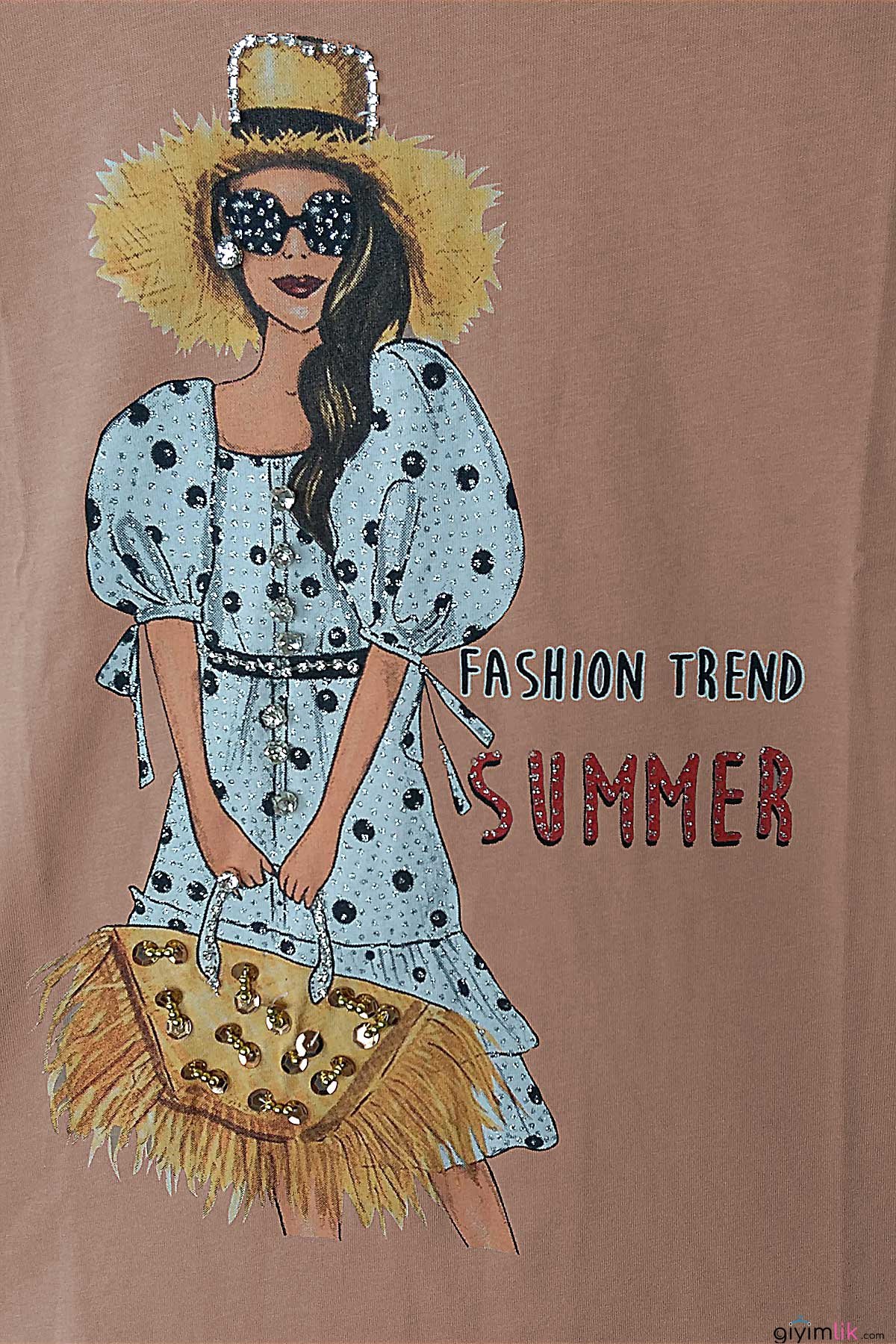 Sütlü kahve rengi, taş işlemeli,yaz mevsimi temalı tişörtümüz S-M-L bedenleri ile stoklarımızda mevcuttur.
