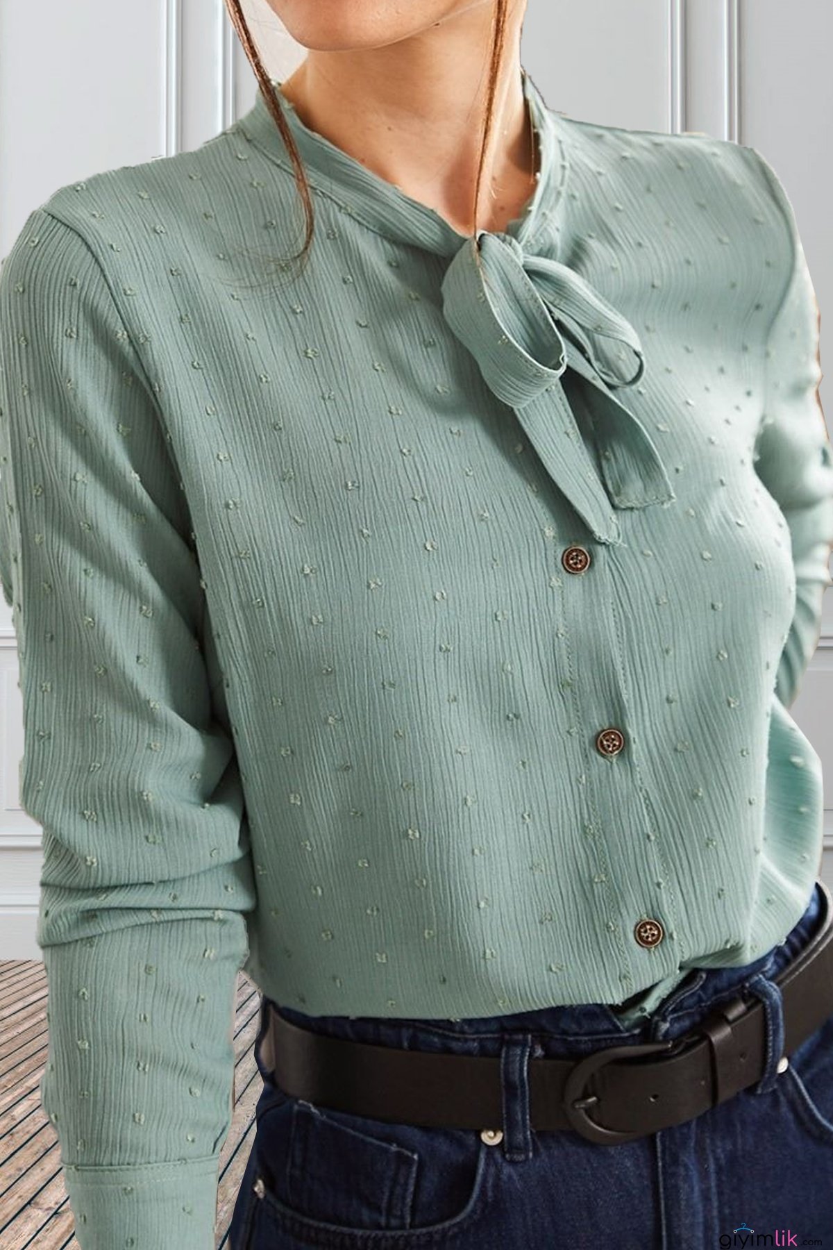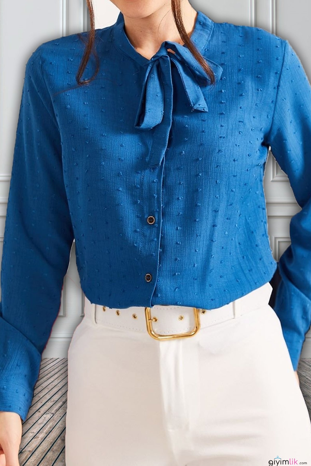 Yakası Bağlamalı Kabartma Desenli Gömlek (3 Renk)